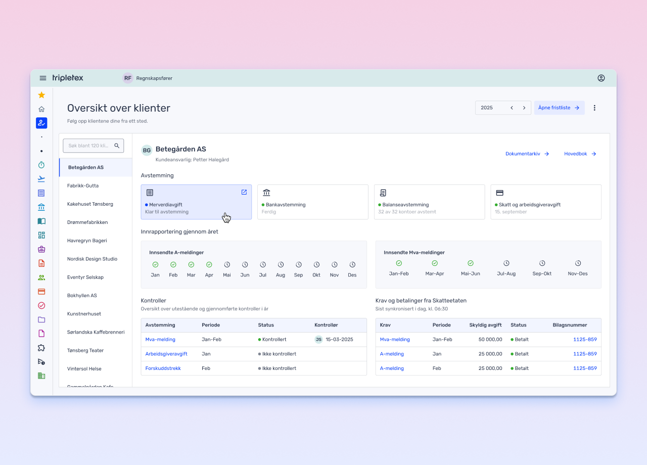 Ja. Tripletex kommer til å gi deg en oversiktlig oppstilling av underliggende dokumentasjon som A07, mva-melding, kontoutskrifter og bilag. All dokumentasjon vil lagres automatisk i både klientens og regnskapsførers dokumentarkiv, slik at du alltid har sporbarhet og dokumentasjon på plass.