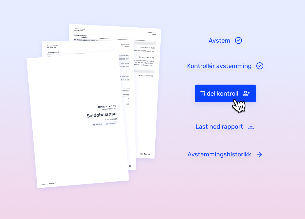 Avstemmingsmodulen støtter tildeling, utførelse og dokumentasjon av kvalitetskontroll. Dette gjør det enkelt å fordele ansvar, sikre at oppgaver blir gjort, og ha dokumentasjonen tilgjengelig dersom du trenger å vise til den senere.