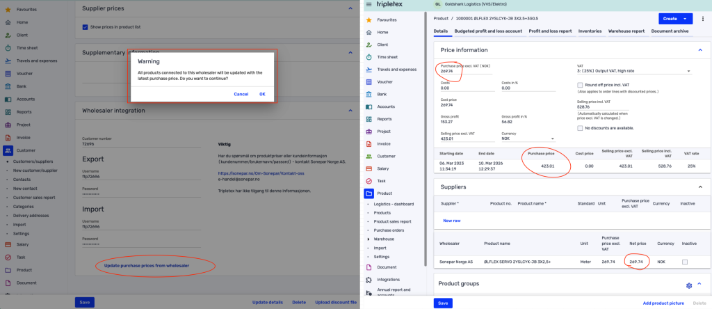 Knappen, som du finner under «Grossistintegrasjon», henter automatisk siste priser fra grossisten du jobber med, basert på el- og nrf-nummer. Dermed sparer du tid, kan være trygg på at prisene alltid er oppdaterte, og har full kontroll på kostnadene – helt uten manuelt arbeid. Raskt, sikkert og effektivt!