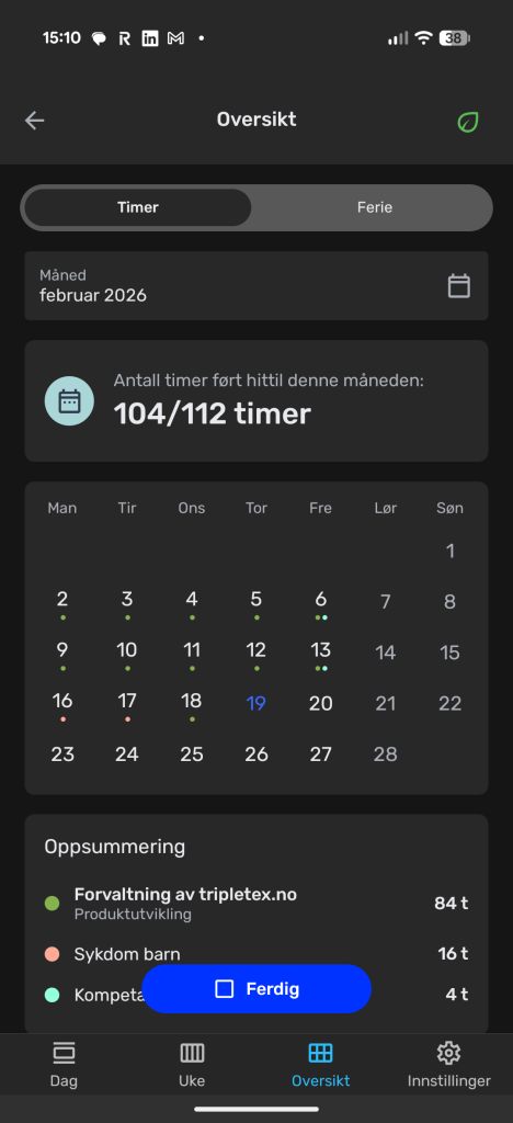 Dette gjør det enkelt å få rask oversikt over arbeidsdagene dine. I tillegg finner du et nytt prosjektsammendrag under kalenderen som viser alle prosjektene og aktivitetene dine for måneden, med totale timer sortert fra mest til minst. Du ser også forventet normaltid for måneden og om du ligger i pluss eller minus. Med denne oppdateringen får du rask og visuell innsikt i timeføringen din, slik at du enklere kan planlegge og følge opp arbeidet ditt.