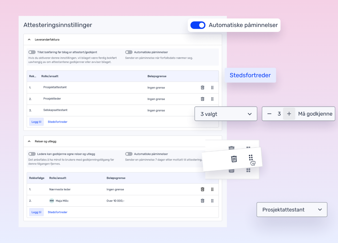Kommer snart: Fleksibel godkjenning av bilag, reiseregning og utlegg med flere nivåer. Passer for selskaper som ønsker en egendefinert flyt med flere godkjennere, godkjenningsgrupper, stedsfortreder og beløpsgrenser for økt kontroll.