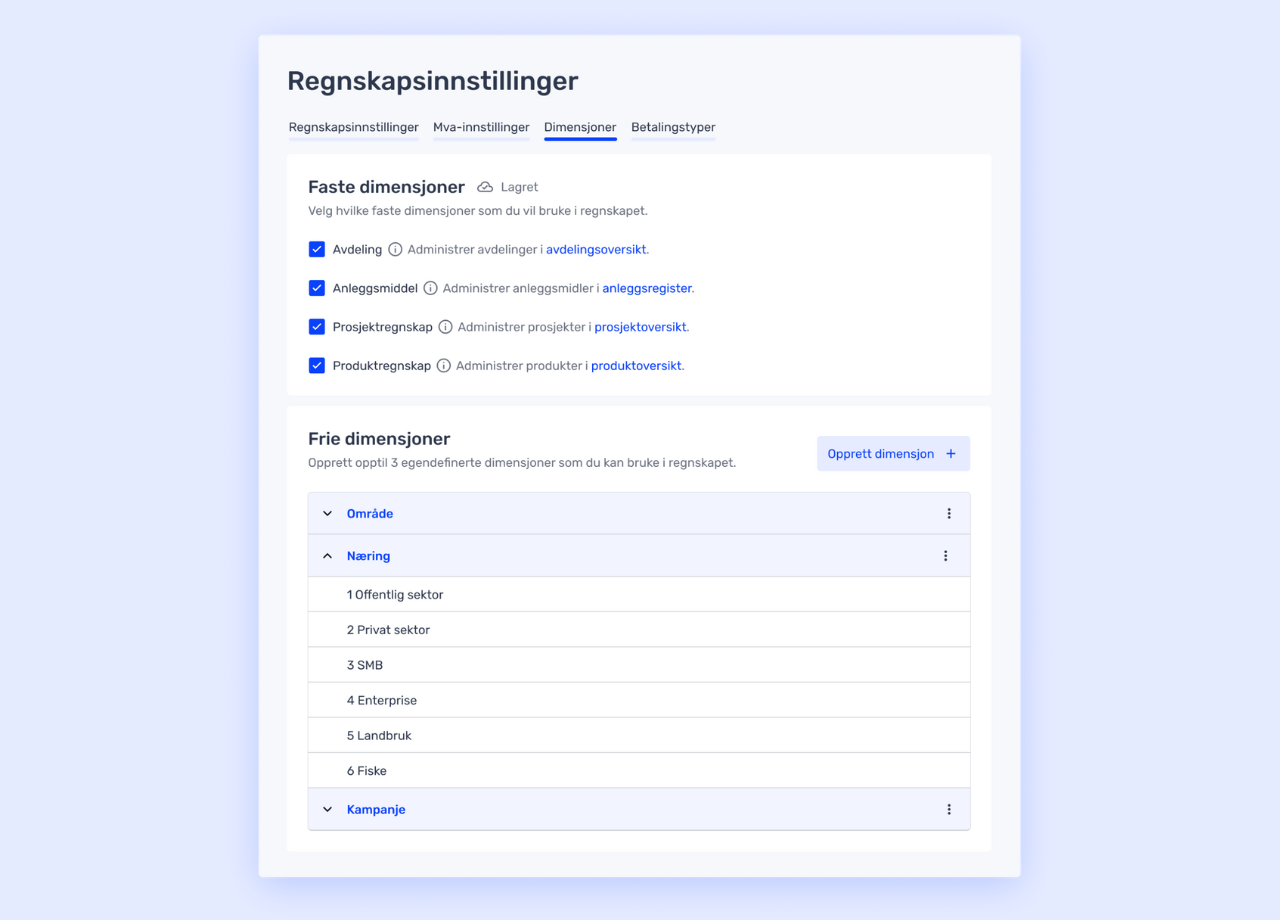 Med frie dimensjoner får du bedre oversikt over inntekter og kostnader. Definer og bruk egendefinerte dimensjoner utover standardfeltene i Tripletex, for mer fleksibel rapportering og oppfølging for dine viktigste forretningsområder.