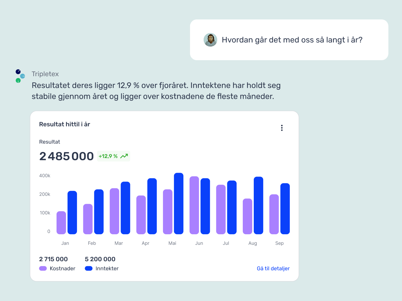 Innsiktsagenten analyserer i tillegg tallene dine i Tripletex og gir deg konkrete anbefalinger – slik at du kan ta bedre beslutninger raskere (betaversjon).