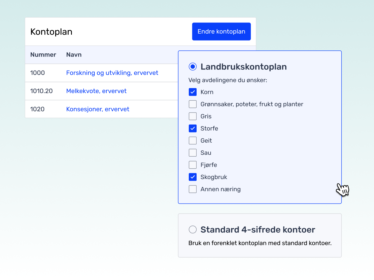 Du kan føre fullstendig landbruksregnskap i Tripletex, alene eller i samarbeid med regnskapsfører. Dette gjelder både jordbruk, skogbruk og fangst/fiske. Fullt oppdatert regnskap til enhver tid!