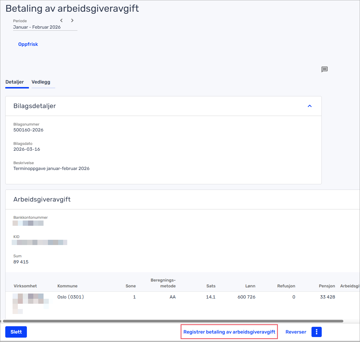 Leveringsfrist/betalingsdato for betaling av arbeidsgiveravgift for terminen fylles automatisk inn basert på lovpålagte frister. Når du har klikket opprett, ser du en oversikt over samlet arbeidsgiveravgift, skattetrekk og eventuelt utleggstrekk for den valgte terminen.