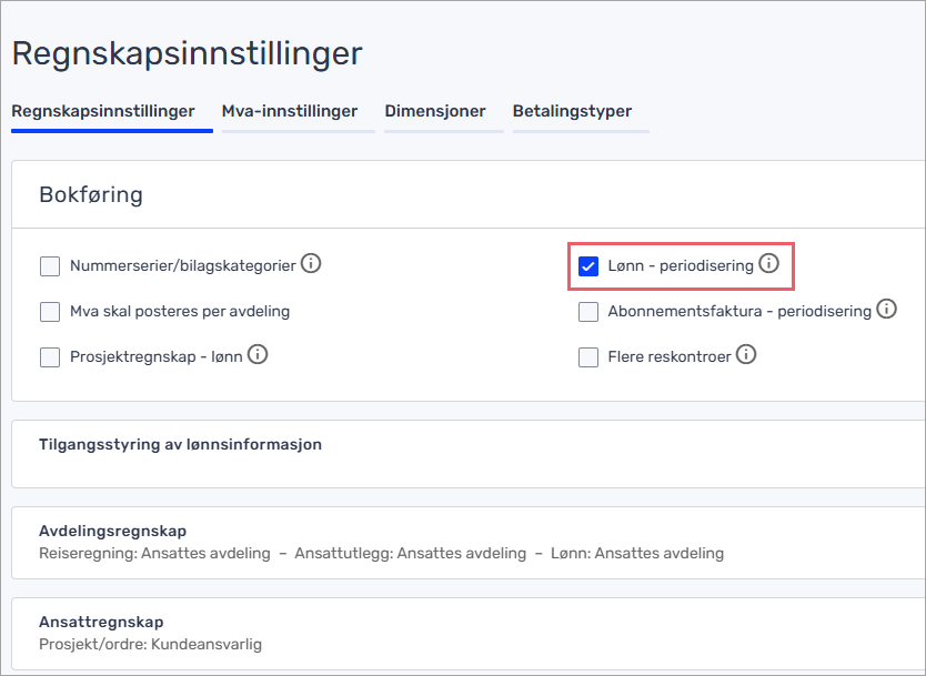 - Under Regnskapsinnstillinger > Bokføring huker du av på «Lønn – periodisering».