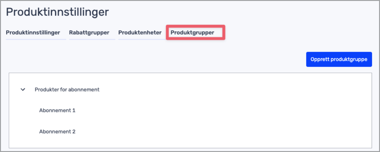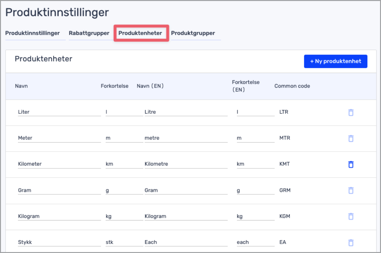 I denne fanen kan du opprette og redigere produktenhetene dine. Noen ligger allerede inne som standard, men du står fritt til å opprette flere via knappen + Ny Produktenhet eller redigere de som allerede ligger inne ved å gjøre endringer i de ulike kolonnene. Ønsker du å slette produktenheter, gjør du dette ved å trykke på søppelbøtten til høyre for produktenheten.