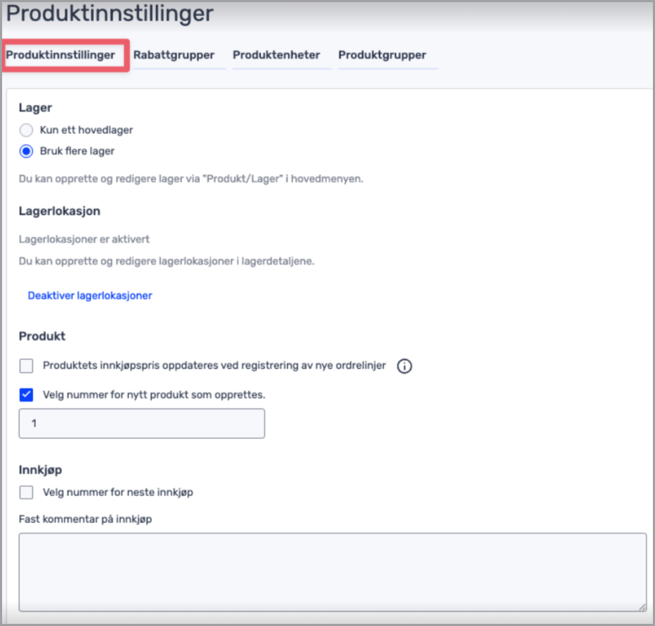 Hvis du huker av på alternativene «Velg nummer for nytt produkt som opprettes» og «Velg nummer for neste innkjøp», kan du sette opp en nummerserie som du selv velger utgangspunkt for. Deretter vil systemet automatisk gi produkt/innkjøp neste ledige nummer ved opprettelse av nytt produkt eller innkjøp.