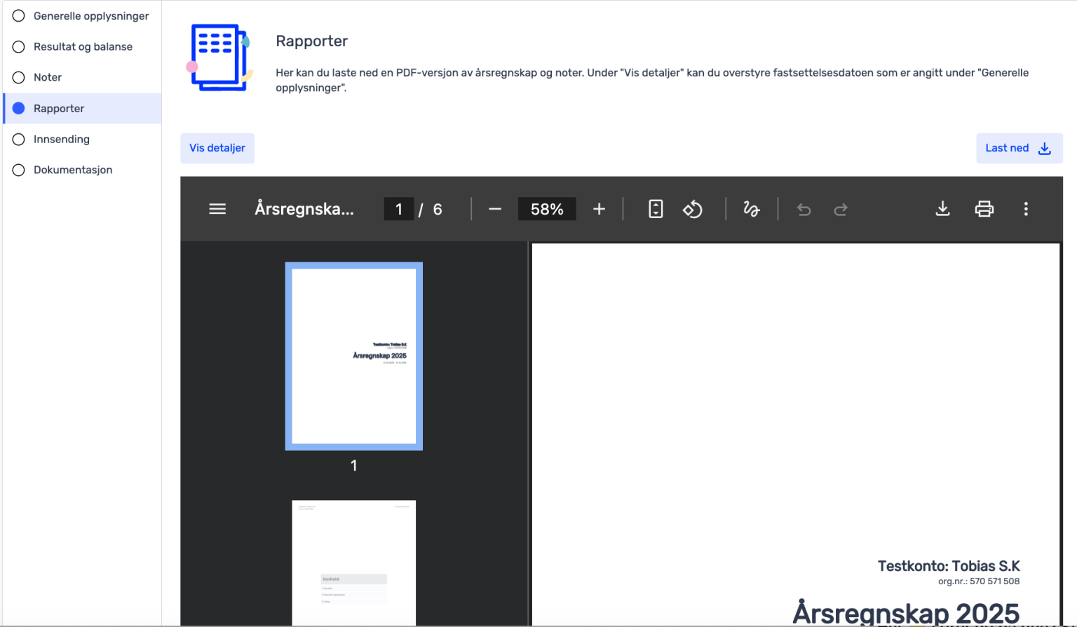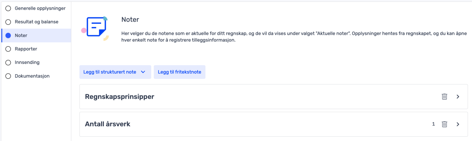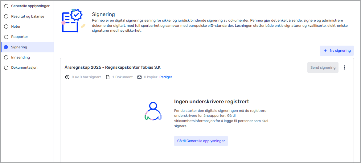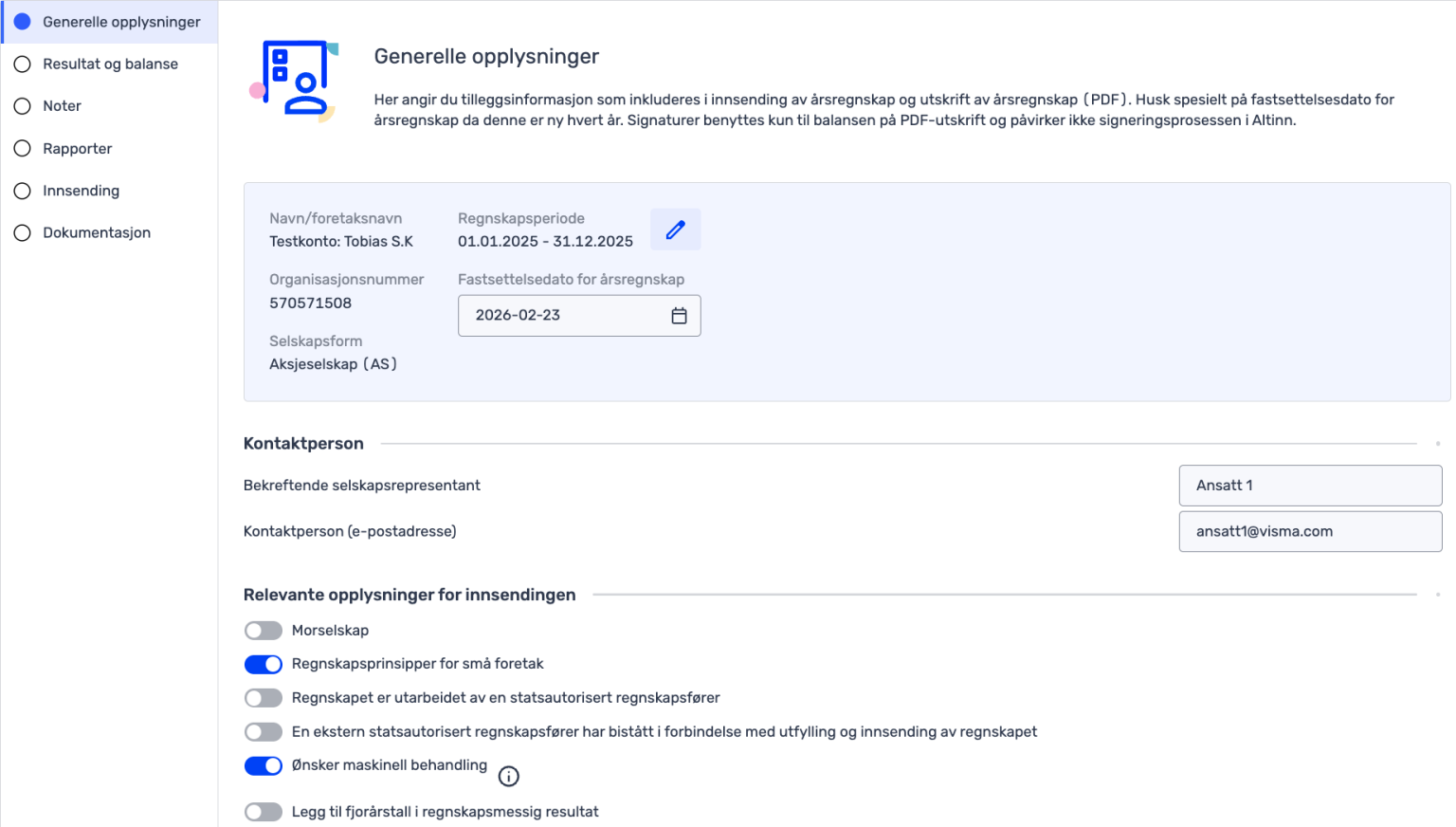 Første steg i årsregnskapet er «Generelle opplysninger». I dette steget finner du all informasjon rundt bedriften. Her legger du inn fastsettelsesdato for årsregnskapet, selskapsrepresentant, e-postadresse, og hvem som signerer årsregnskapet.