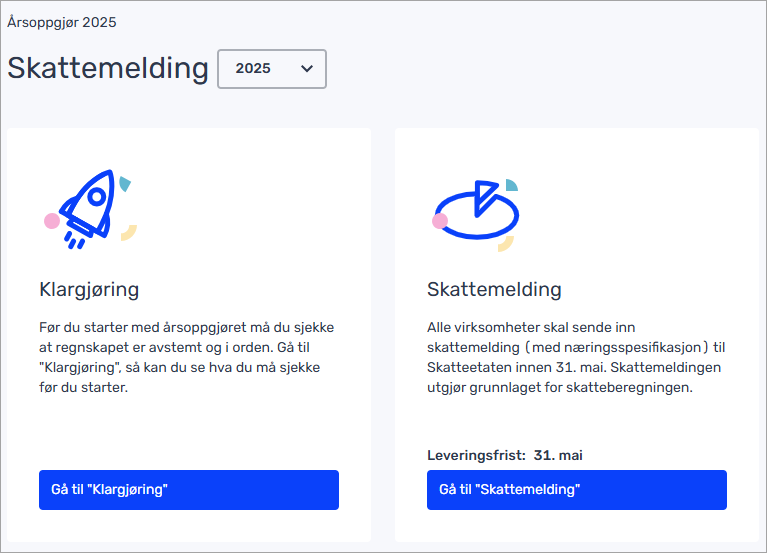 Skattemeldingen sendes inn fra Skatteetaten sine sider, etter at du har sendt inn næringsspesifikasjonen fra Tripletex.