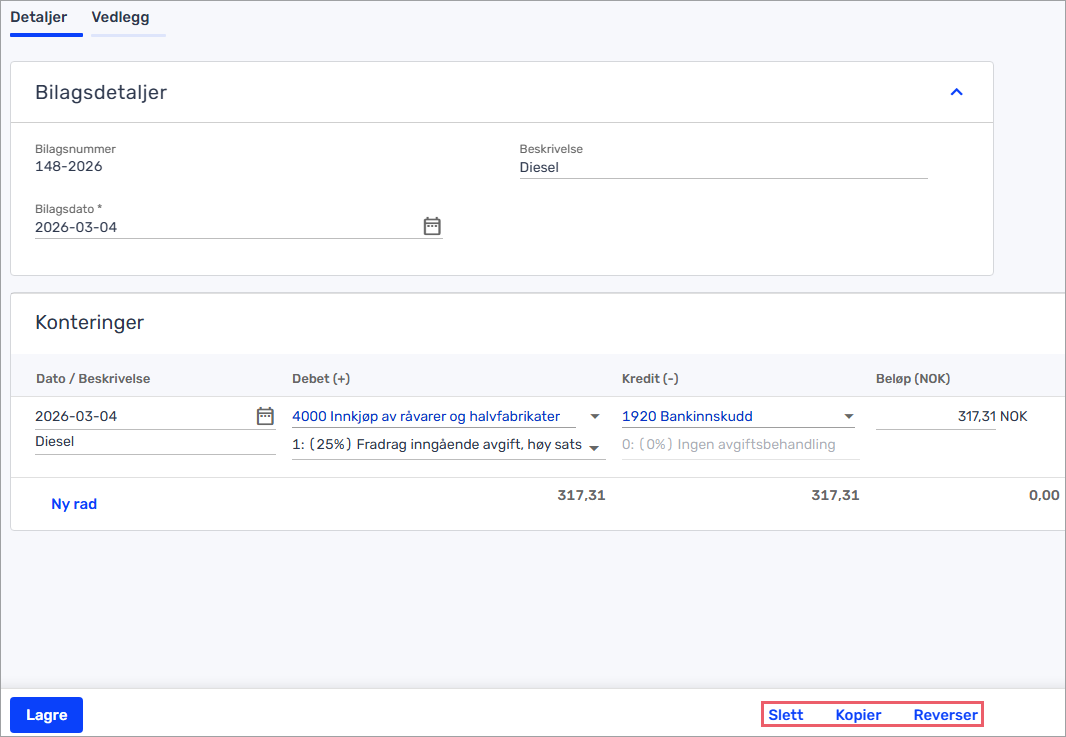 Du kan endre et bilag ved å klikke på selve bilagsnummeret. Nummeret kan du finne for eksempel i hovedboken eller i bilagsoversikten. Etter du har gjort endringer, må du klikke «Lagre» nederst på siden.