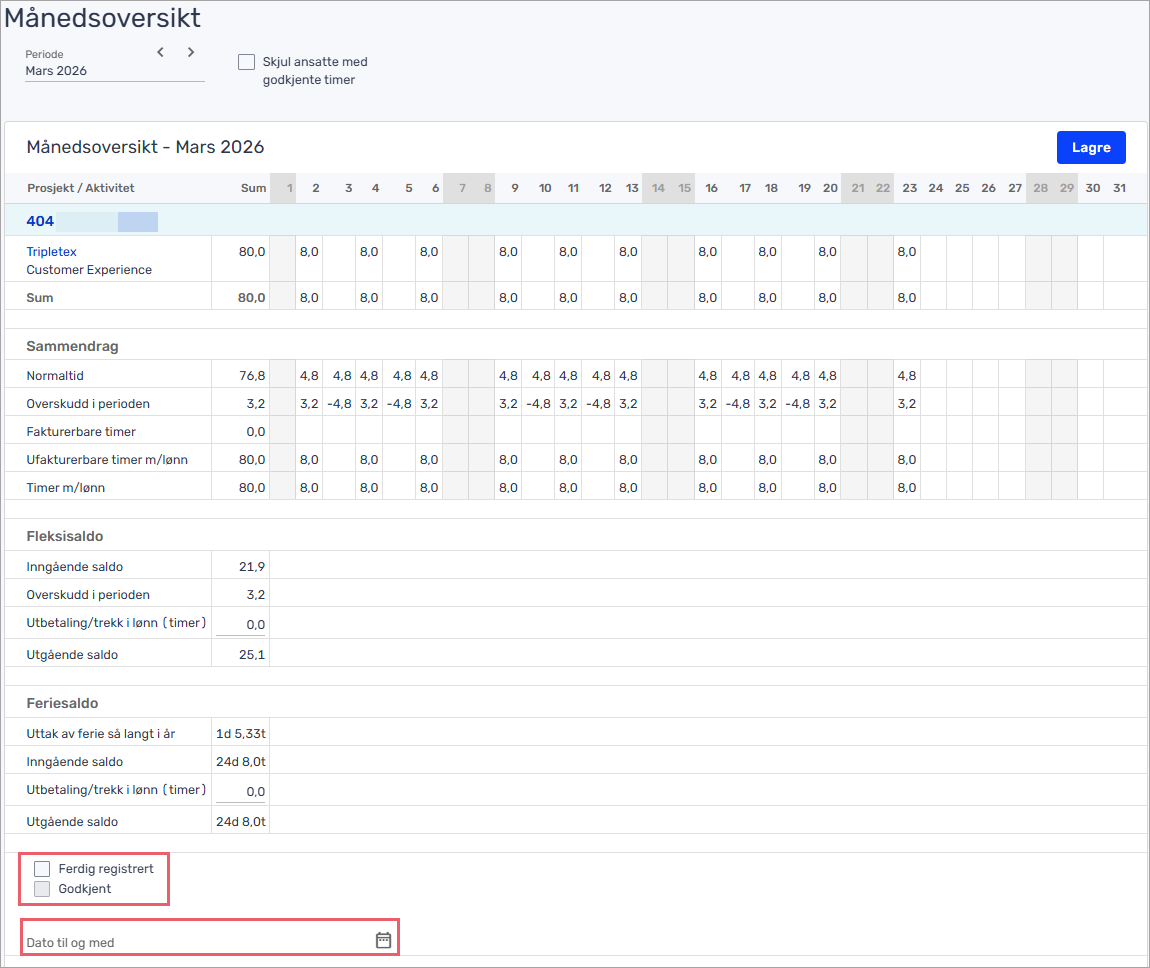 I månedsoversikten godkjenner du timer til og med en dato, gjerne den siste dagen i måneden. Har du ansatte med timelønn og lønnskjøring i Tripletex, må denne være aktivert slik at grunnlaget av timeføringen kommer til utbetaling i lønnsmodulen.