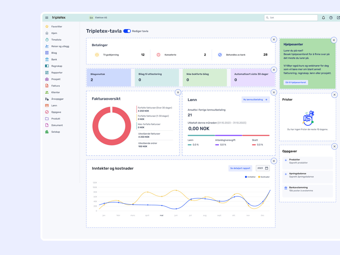 Få en bedre oversikt over kostnader og inntekter med Tripletex. Ved å samle alle de funksjonene du trenger i ett system sparer du mye tid og penger, og får bedre kontroll over lønnsomheten og økonomien.